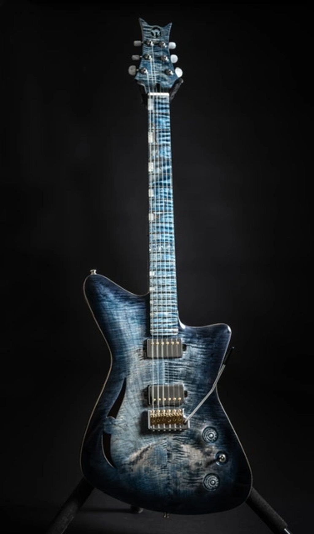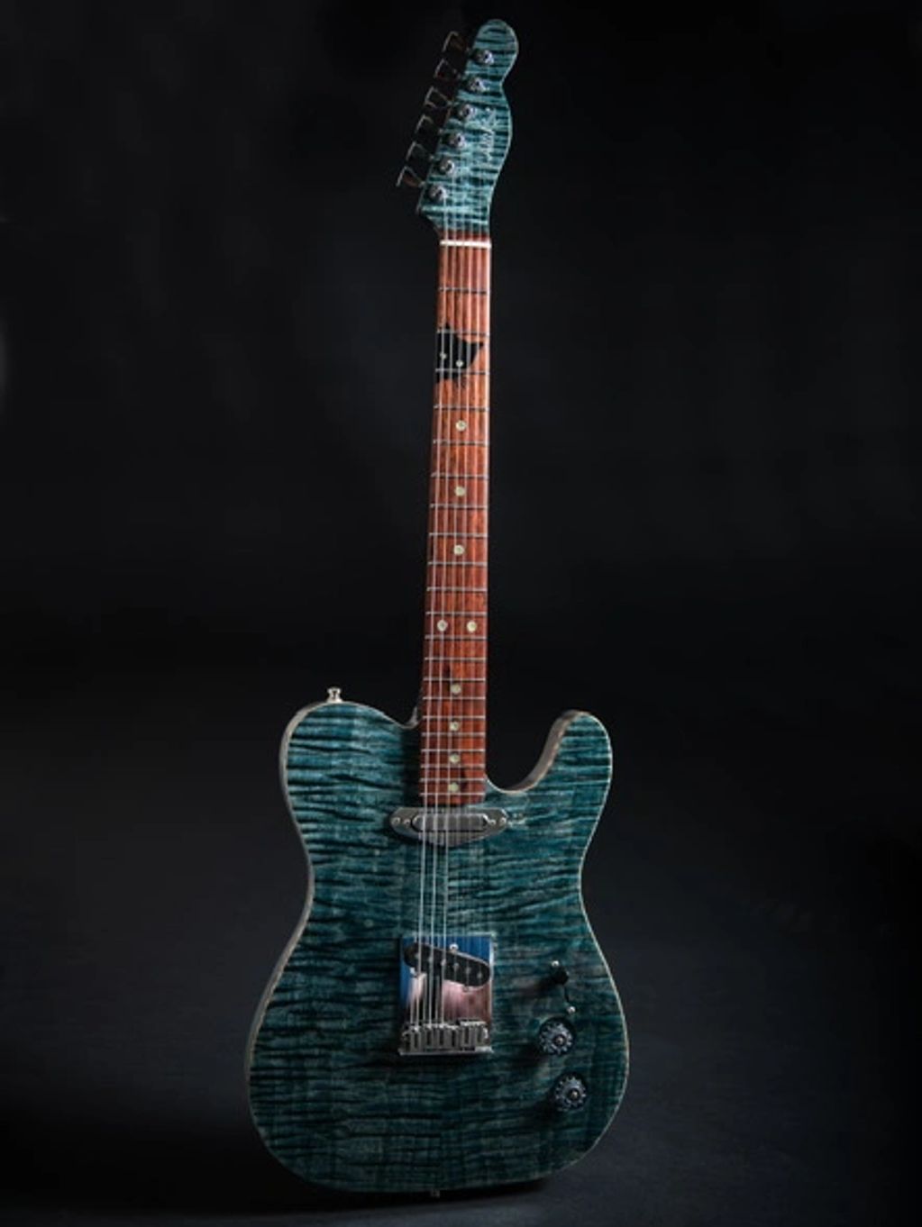 This was one of my favorite creations. This guitar featured a sandblasted ash body with a curly maple top. and ironwood fretboard. Most notable, I hand cut an ebony cat inlay with glow in the dark eyes.